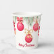 Ornamentos de árboles de Navidad rojos y dorados y ramas de pino y las palabras Feliz Navidad (o cualquier texto) en un fondo de marfil, estas tazas de papel son geniales para cualquier ocasión de Navidades de vacaciones.