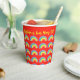 Arcoiris sobre tazas rojas para una fiesta de cumpleaños con arcoiris. La escritura amarilla dice que Christina tiene cuatro años.