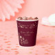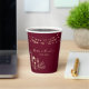 Estas elegantes tazas de papel para bodas cuentan con fondo burdeos, brillantes luces de cuerda y obras de arte florales de oro. Perfecto para bodas de otoño o invierno, estas tazas se personalizan con el nombre y la fecha de la pareja.