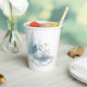Navidades de tazas de papel con temática, con hermosas acuarelas de un ciervo blanco y pinos. El texto azul personalizado, en la parte inferior, se puede personalizar para leer lo que se desea.