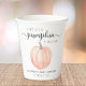 Cuidados tazas de papel neutrales en género para tu ducha de bebé de otoño con "A Sweet Little Pumpkin Is On Your Way", escritas en una simple tipografía gris y un guión elegante con toallitas, y una linda calabaza de naranja pastel. Indique el género del bebé si lo desea (por ejemplo, "está en camino").