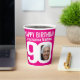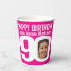 Personalice estas tazas de papel para fiesta de cumpleaños número 90 de color rosa intenso y blanco con el nombre de la cumpleañera y dos fotografías en el 0 del 90. Texto divertido y diseño de foto personalizada. Ideal para usar en una fiesta de cumpleaños noventa para mostrar una foto de la cumpleañera ahora y otra de su pasado. Otros artículos a juego están disponibles. © Arte gráfico y diseño original de www.mylittleeden.com