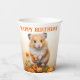 Estas tazas de papel muestran una encantadora imagen de un hámster sirio parado en sus patas traseras entre flores naranjas, con las palabras "FELIZ CUMPLEAÑOS". Ideal para una fiesta de cumpleaños para cualquiera que ame hámsters. contenido generativo