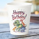Este lindo dinosaurio verde feliz diseño de la copa de papel de cumpleaños muestra adorables dinosaurios de acuarela de varios colores. Este diseño también muestra confeti festivo así como la frase "feliz cumpleaños". Los colores principales son los verdes, rojos y azules. ¡Disfruta este divertido diseño de taza de papel fiesta de cumpleaños para niños!