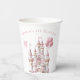Cuidada, chica, copas de papel de cumpleaños Princesa para tu princesa especial. Castillo de color agua, de piedra rosa y blanca con globos rosados bonitos. Añade tu nombre para personalizar.