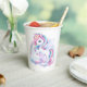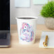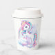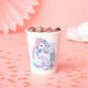 Cups de papel para una mágica fiesta de cumpleaños con un adorable unicornio con alas en las nubes sobre un fondo arcoiris.