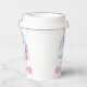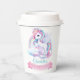 Cups de papel para una mágica fiesta de cumpleaños con un adorable unicornio con alas en las nubes sobre un fondo arcoiris.