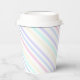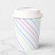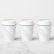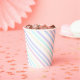 Cups de papel para una mágica fiesta de cumpleaños con un adorable unicornio con alas en las nubes sobre un fondo arcoiris.
