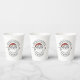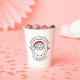 This paper cup features a black doodle art line drawing of a cute Santa Claus with a red hat within a circle, with “Merry Christmas” greeting above and a family name below, and with red dots separating the two. Both the greeting and family name can be personalized right on the product page.