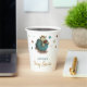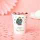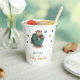 Adorables tazas de papel con un ilustracion de un bebé dinosaurio que incuba de su huevo. Personalizó el texto con su propia información. Ilustrado por Patricia Álvarez.