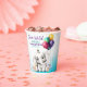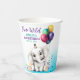 Elefante lindo en sombrero de fiesta con globos, cuerno y confetti celebra el cumpleaños.
