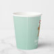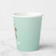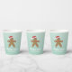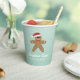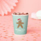 Esta taza de papel de intercambio de galletas de Navidad presenta a un lindo hombre de pan de jengibre con un sombrero de Santa. El fondo es un suave verde azulado con puntos blancos de confeti para parecer nieve cayendo.