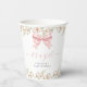 Elegant coquette styled 'Baby in bloom' themed baby girl shower paper cups featuring cute pink watercolor bow surrounded by pink flower bloom wreath. Perfect for sweet botanical style spring or summer baby celebrations.