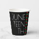 Diecinueve tazas de papel para la celebración. Tienen un diseño que incluye un fondo negro, una franja roja, negra y verde, y las letras están en blanco. Decimoctavo periódico rojo negro verde de vacaciones recorta diseño de vacaciones | ©Melissa Patton - Diseñador