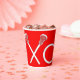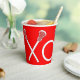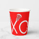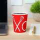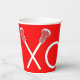 Tazas únicas para fiesta de lacrosse, noche de mayores o eventos en día de juego con arte de palo de lacrosse xoxo en fondo rojo.