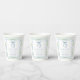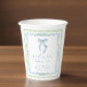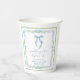 Tazas de papel elegantes para despedida de soltera con marcos de acuarela florales azules y verdes con volantes vintage, un lazo coqueto azul caprichoso de acuarela, "algo azul antes de hacerlo" presentado en una elegante letra cursiva azul, y el nombre de la novia y la fecha de la despedida en tipografía serif clásica.