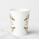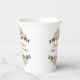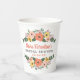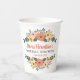 Las tazas de papel para la fiesta de regalos de boda presentan un diseño de borde ilustrado floral caprichoso con flores de acuarela coloridas y vegetación en tonos toscanos dorados de amarillo, rosa sonrosado, naranja coral rojo, violeta púrpura y tonos ricos de verde. Perfecto para una boda de verano u otoño. El diseño orgánico pintado a mano enmarca hermosamente el texto personalizado moderno y elegante en colores gris, verde y naranja que se puede personalizar completamente para la encantadora futura novia.