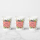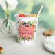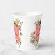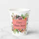 Vasos de papel elegantes para boda o fiesta de despedida de soltera, hechos en blanco con flores silvestres de colores. Una zona de texto en coral y dorado, a ambos lados, tiene texto personalizado en negro. Personalice el texto según las necesidades de su evento.