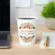 Las tazas de papel para la fiesta de regalos de boda presentan un diseño de borde ilustrado floral caprichoso con flores de acuarela coloridas y vegetación en tonos toscanos dorados de amarillo, rosa sonrosado, naranja coral rojo, violeta púrpura y tonos ricos de verde. Perfecto para una boda de verano u otoño. El diseño orgánico pintado a mano enmarca hermosamente el texto personalizado moderno y elegante en colores gris, verde y naranja que se puede personalizar completamente para la encantadora futura novia.