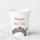Dos tazas de papel de 2 cumpleaños con auto de carrera retro azul.