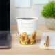 Vibrantes flores amarillas de girasol con borde de ramo de follaje verde que hace elegantes tazas de papel personalizadas boho chic de primavera verano otoño jardín ducha de novia con caprichosa caligrafía moderna y elegante sobre un fondo blanco.