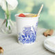 Estas tazas de papel fiesta de ducha de novia tienen un diseño monocromático con un set de té azul y blanco rodeado de flores.