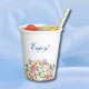Personaliza esta Taza de Papel para Desayuno Nupcial con Estampado Floral Brillante, diseñada para infundir tu celebración con un aire de elegancia y encanto. Delicadamente adornada con la belleza atemporal de rosas de color melocotón, rosa claro y lila, entrelazadas con un suave follaje, esta taza emana un sentido de romance y sofisticación. Contra un fondo de blanco crujiente, la intrincada disposición floral se destaca, creando un punto focal cautivador que complementa sin esfuerzo cualquier decoración de desayuno nupcial. La mezcla de tonos sutiles y flores exuberantes evoca una sensación de tranquilidad y refinamiento, perfecta para una ocasión que celebra el amor y los nuevos comienzos, combinando un diseño chic con funcionalidad práctica. Ya sea que estés bebiendo refrescantes bebidas o disfrutando de deliciosos dulces, esta