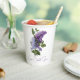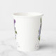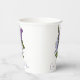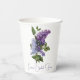 Tazas de papel para ducha de novia elegantes hechas en blanco, con lilas púrpuras y texto morado personalizado, en ambos lados. Personaliza el texto según las necesidades de tu evento.