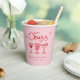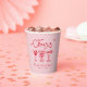 ¡Arriba, abajo, al centro y pa' dentro! Brindar a la futura novia con adorables tazas personalizadas que incluyen su nombre y fecha de evento. El diseño es ilustraciones extravagantes rojos de cócteles, garabatos cardíacos y "Saludos" en un guión divertido con un fondo rosado. © Kimbellished, LLC
