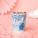 Esta elegante taza de papel Dulce Dieciséis tiene un gigantesco falso purpurina azul zafiro '16' y una cinta sobre un fondo satinado adornado con un patrón de joyas colgantes. Especifique los detalles del evento en la parte posterior utilizando la plantilla personalizado. Busque ID260 para ver otros productos con este diseño.