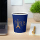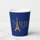 Glam Paris temática Sweet 16 tazas de papel para fiestas de cumpleaños, con purpurina dorado leyendo el texto de París, con la Torre Eiffel parado para la letra a. Hay servilletas, platos e invitaciones que coinciden.