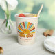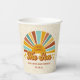 Estos elegantes y divertidos vasos de papel para la ducha para bebés cuentan con un sol de boho dibujado a mano en tonos retro de terracota, amarillo dorado y agua. La tipografía de estilo vintage/retro dice, "Aquí viene el hijo", una linda obra de palabras que es perfecta para un niño en el camino! Un overlay texturado añade un toque de época. *Ilustracion original de Orabella Prints.