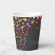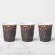 La copa de papel para el cumpleaños de este niño incluye un tema de Estrella Pequeña Twinkle Twinkle con fondo de tiza gris oscuro y brillantes estrellas rosas, naranjas y plateadas.