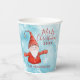 Crea unas tazas de papel personalizadas únicas para tu fiesta familiar con un diseño elegante que incluye un refrán de Feliz Navidad, un gnomo alegre en rojo y plantillas de texto para el año y el nombre de la familia. Estas tazas de papel azul claro y rojo con nevado son perfectas para las vacaciones de invierno.