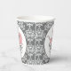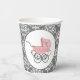 tazas de papel de moda para la ducha de bebé, hechas en un patrón de damasco gris y blanco. Gráficos de un pequeño cochecito rosa de estilo antiguo, decoran la parte delantera y trasera de la taza. Personalizar si desea añadir texto a esta preciosa placa de papel para la ducha de bebé. Se ofrecen invitaciones y servilletas de papel coincidentes.
