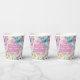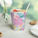 Vasos de papel para baby shower nupcial con fondo floral pastel y marco rosa.