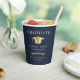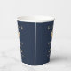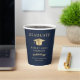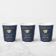 Elegantes tazas de papel de la fiesta de graduación de color azul oscuro con una gorra de oro, "Graduado" y el nombre del graduado, la escuela y el curso de clase en la tipografía clásica de los séricos de oro.