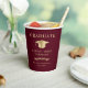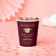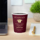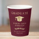 Elegantes tazas de papel de la fiesta de graduación en rojo burdeos con una gorra de oro, "Graduado" y el nombre del graduado, la escuela y el curso de clase en tipografía clásica de oro.