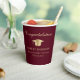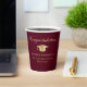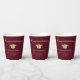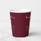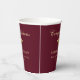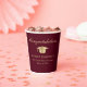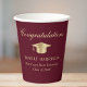 Elegantes tazas de papel de la fiesta de graduación en rojo burdeos con una gorra de oro, "Felicitaciones" en un guión clásico y el nombre del graduado, colegio y año de clase en una simple tipografía moderna.