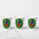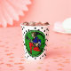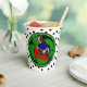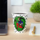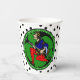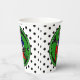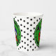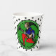 Estas tazas de papel presentan la variación original de HoMeArt de un elfo maxfield parrish pre-WI con puntas de polka blanco y negro contra medallón redondo kelly verde flotando sobre un fondo de punto de polka negro sobre blanco. El saludo 'Feliz Navidad' se repite rodeando el medallón.