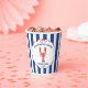Dale un toque náutico a tu fiesta de despedida con estas tazas de papel personalizadas. Presentan mi ilustración de estilo realista dibujada a mano de una langosta en rojo con tu texto personalizado en azul. Todo el texto está listo para tu toque personalizado, incluyendo el eslogan "Ella encontró a su langosta" en la parte superior. El texto y el gráfico están enmarcados dentro de un marco redondo con ribetes y un lazo rojo en la parte superior que se encuentra contra un fondo a rayas azules y blancas. El diseño del texto y el gráfico aparecen en ambos lados de la taza.
