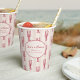 Nuestras tazas de papel para despedida de soltera de langosta de verano son perfectas para tu celebración junto al mar. El diseño caprichoso de la costa presenta letras rojas veraniegas e ilustraciones de langosta sobre un fondo de rayas de cabana de color melocotón pálido. Dos líneas de texto personalizado están enmarcadas por un borde de garabatos de concha ondulada. Se muestra con "ella es un tesoro" y el nombre de la futura novia.