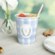 Una acuarela de gingham azul clásico con un escudo de laurel para un monograma inicial.