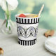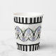 En el puente de la transición del Art Nouveau al Art Deco, el diseño original de estas tazas de papel, se presentan Scallop Seashells opalescentes de color azul-verde, Lilies de color Celadon y rosa pálido, ondulantes cuerdas gris plateado entrelazadas de manera "Doble holandés" a través de arcos góticos negros y franjas verticales en blanco y negro por encima y abajo.