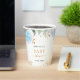 Para una elegante ducha de novia, celebrando a un bebé. Un fondo blanco moda. Decoradas con flores azules claras, flores (rosas) y hojas de eucalipto de color verde agua, brotes, vegetación y brotes de oro falsos. Polvo purpurina dorado. Personalice y agregue un nombre y una fecha. Letras negras y doradas.