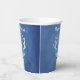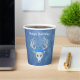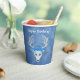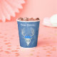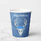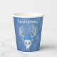 Estas tazas de papel son una mezcla de tonos de azul con una fantasía de cabeza de ciervo blanco que tiene tres rosas azules y cuernos en la cabeza. Personalice el texto de Feliz Cumpleaños con las plantillas en la parte delantera y trasera.