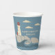 Añade un toque playero a los fiestas de playa y otros eventos especiales con estas tazas de papel personalizadas. Disponen de un sencillo ilustracion náutico de un faro de color rojo y crema o marfil. El faro se encuentra en una orilla rocosa con olas que caen por debajo y nubes de color crema en el cielo. El gráfico se coloca sobre un fondo azul francés suave.