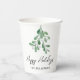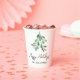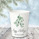 Estas tazas de papel festivo están decoradas con mistletoe acuarela y dicen Felices Fiestas en tipografía de escritura elegante. Personalizable fácil. Acuarela original © Michele Davies.