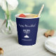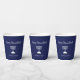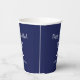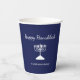 Happy Hanukkah Blue Holiday paper cup, con un sencillo diseño de menorah blanca y tipografía de escritura. Con letras en personalizable blanco, puede añadir su propia información. Una manera festiva de celebrar con amigos y seres queridos.