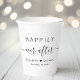 tazas de papel de moda para la recepción de tu boda, fiestas de compromiso, cena de ensayo, duchas de parejas y otras celebraciones de bodas que presentan "Feliz eterno después" en una tipografía sencilla y moderna y un guión elegante con chispas, tus nombres unidos por un corazón y tu fecha boda.